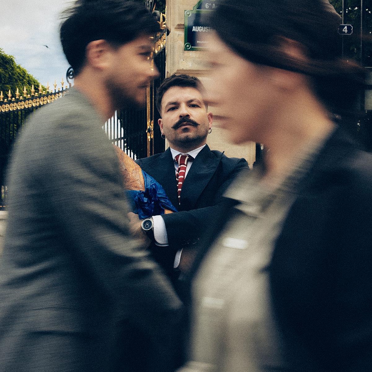 The Beaubleu 19.24 Midnight Blue features a pad-printed enameled dial with railroad indexes and a signature blue floating second hand that rotates weightlessly, adding a touch of magic. Its 39 mm sculptural case combines polished and brushed surfaces, with a hidden crown at 3 o’clock for symmetry. Part of the Seconde Française collection, this limited edition of 888 pieces has a unique number engraved on the caseback. The open caseback showcases the France Ebauches FE movement, with a signed oscillating weight hovering above a double-bridge balance wheel.