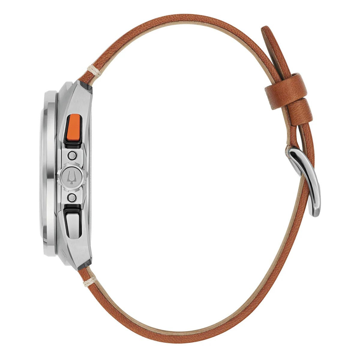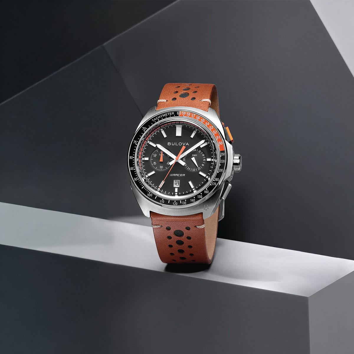 Built on Bulova's vibrant motorsport heritage – from soapbox derbies to elite auto racing – the new men’s Racer chronograph is engineered for performance. Its contoured silver-tone stainless steel case echoes the aerodynamic curves of high-speed cars, while a two-tone orange and black tachymeter ring adds functionality. The black 5-hand chronograph dial features an orange and white racing-pattern chapter ring, a date display at 6 o’clock, and subdials for chronograph minutes and 24-hour time. A bold orange chronograph seconds hand ensures clear legibility, and applied silver-tone markers with luminous hands enhance low-light visibility. The watch is finished with a perforated brown leather racing-style strap and pin buckle. Perfect for the track or daily commute, the Bulova Racer chronograph is a sleek tribute to racing and speed.