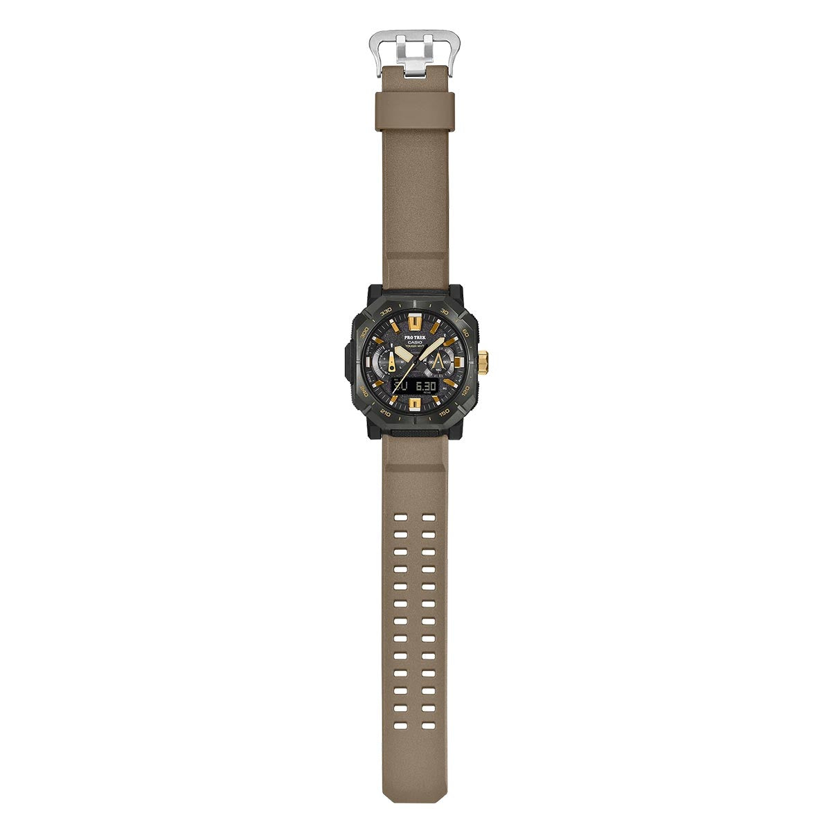 Scale new heights with the Casio PRO TREK PRW-B1000 — a rugged, adventure-ready watch built for extreme outdoor conditions. Inspired by Yosemite’s El Capitan, the square stainless-steel bezel and piton-style indicator hand reflect a spirit of climbing and exploration. Tough Solar ensures reliable charging even under weak light, while radio-controlled Multiband 6 calibration and Bluetooth keep your time precise wherever you are. Triple Sensor technology delivers essential data — direction, barometric pressure, altitude, and temperature — and the double LED light illuminates both analog and digital displays with a simple tilt. Large, glove-friendly buttons make operation easy on the go.