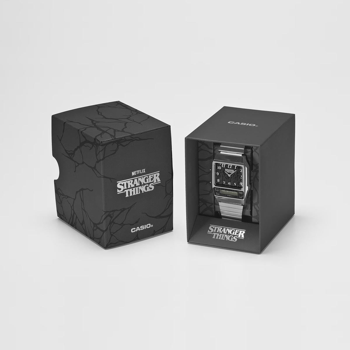 A special collaboration model with the Netflix series "Stranger Things," which will reach its final chapter with Season 5 in November. This timepiece is based on then Casio AQ-800. Drawing from the dual worlds of the story — the familiar reality and the eerie “Upside Down” — the design weaves key elements of the series into every detail. The dial features a pattern of twisting vines, evoking the creeping influence of Vecna. The indexes are rendered in a raised metallic finish using the distinctive Stranger Things typeface, adding depth and character. The case back is engraved with the Stranger Things logo, while the clasp cover bears the number “001” — the tattoo seen on Vecna. The watch comes in special packaging that highlights both the Demogorgon and the signature vines, capturing the threatening forces the characters face throughout the series. This special collaboration celebrates the arrival of Season 5, the final chapter in the Stranger Things saga.