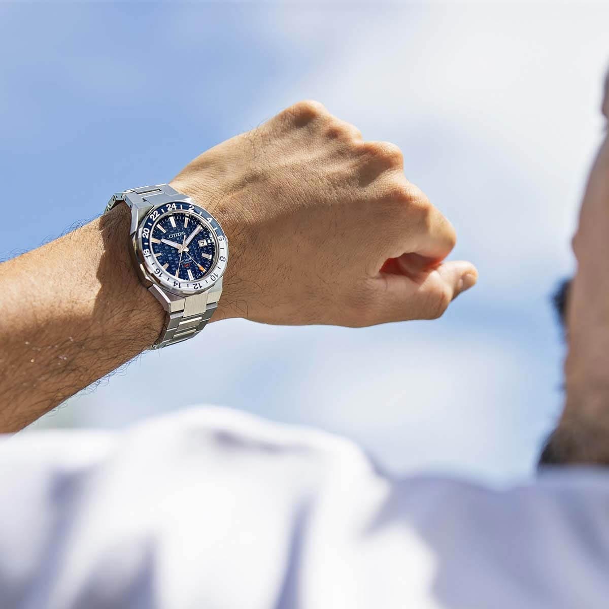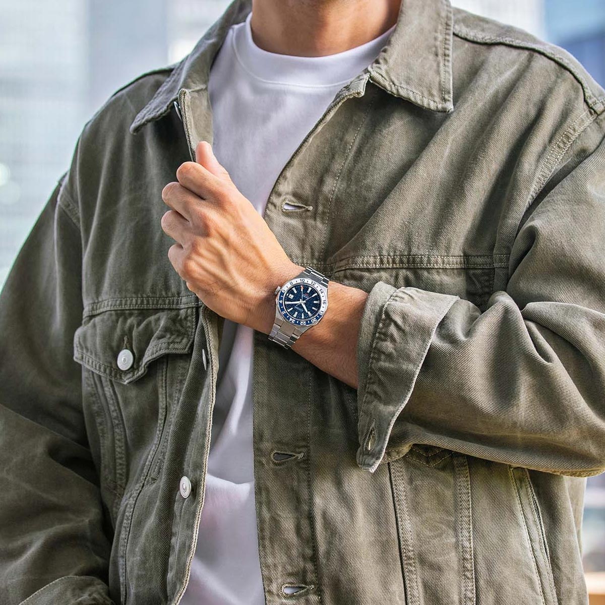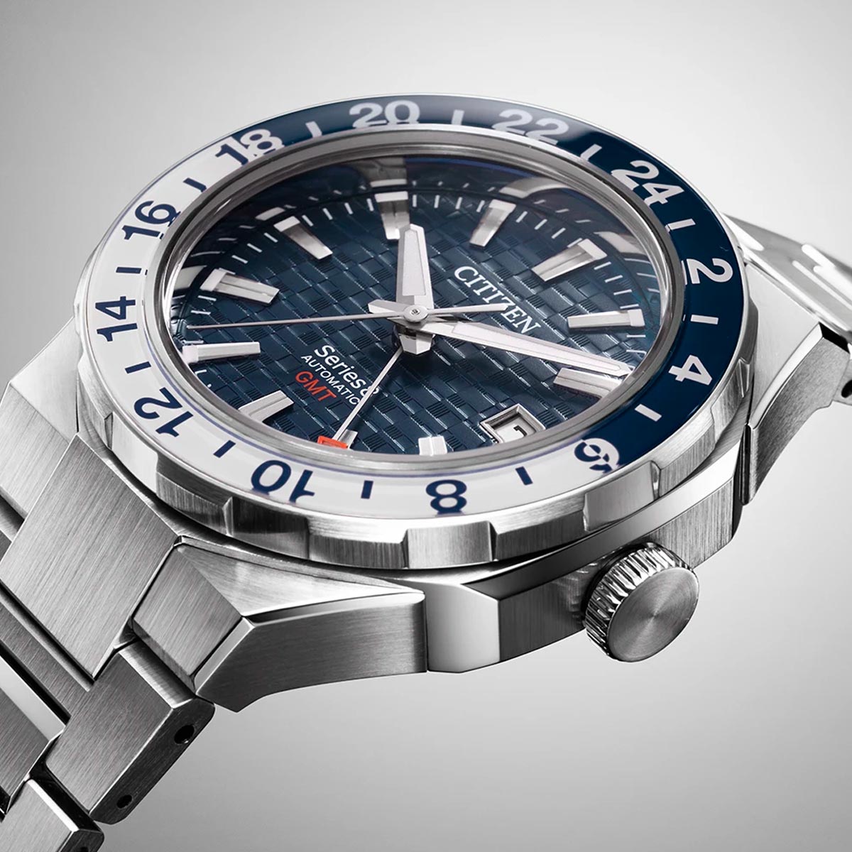 The Citizen Series 8 880 GMT is crafted for everyday wear and global adventures alike, blending functionality with contemporary style. The 41mm silver-tone stainless steel case is complemented by a blue and white bi-directional bezel, showcasing Citizen’s signature mix of brushed and polished finishes. Engineered for performance, it offers 100m water resistance and magnetic resistance up to 16,000 A/m. Powered by the high-performance Caliber 9054 automatic GMT movement, it features an independently adjustable hour hand for effortless time zone tracking, a 50-hour power reserve, and precision accuracy of +20 / -10 seconds per day. The integrated stainless steel H-link bracelet enhances comfort and style, while the sapphire crystal reveals a textured blue dial with luminous hands, applied indices, and a date display at 3 o’clock. A vivid orange GMT hand adds a sporty finishing touch.