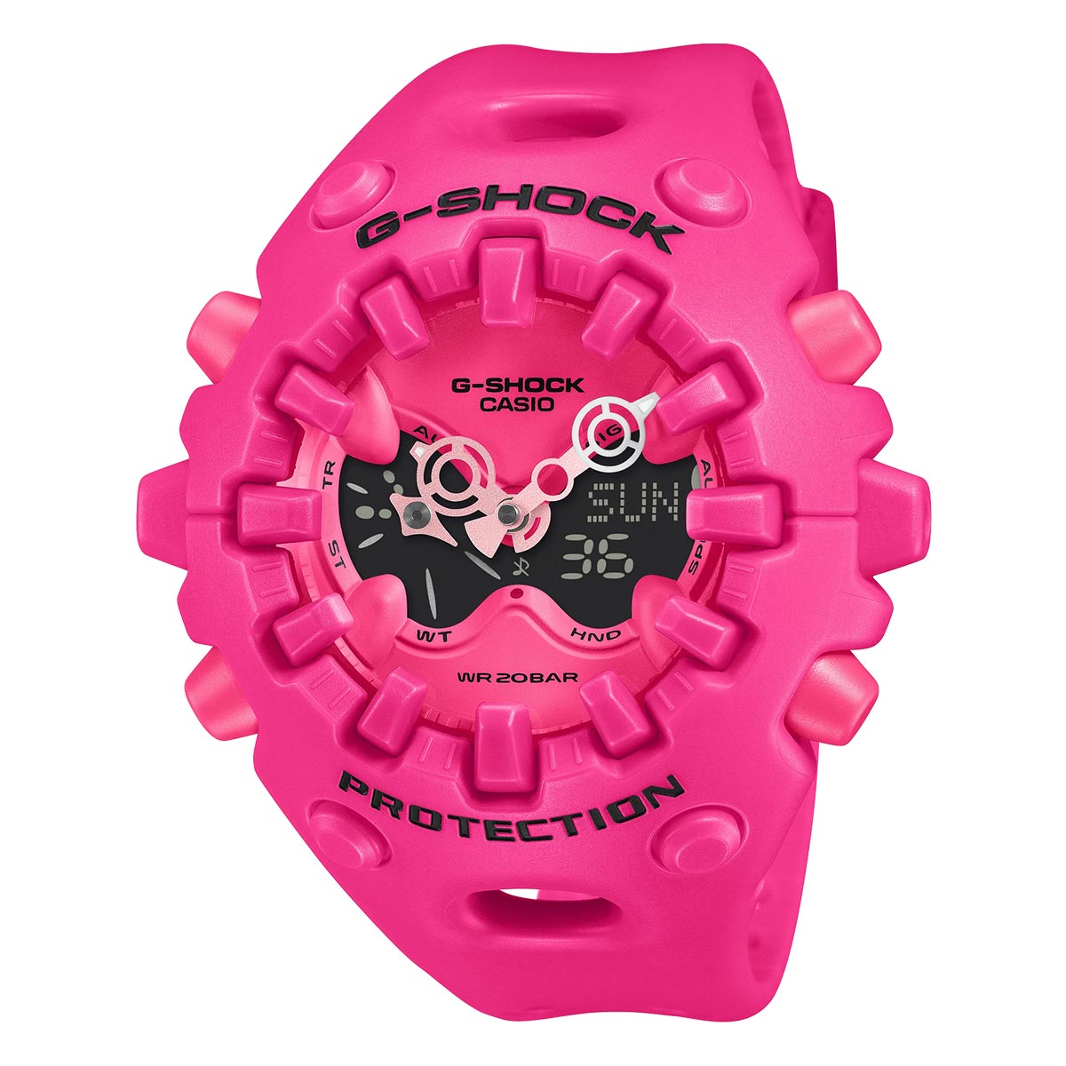 Experience the next evolution of toughness with the G-SHOCK GA-V01 — a bold reinterpretation of G-SHOCK’s signature design and engineering. Its sculpted, organic case with sharp edges, full-screen LCD, and metallic open-work dial deliver a striking fusion of strength and innovation. The standout Shock Release Hand uses a magnetic attachment to absorb impact, allowing for larger, more expressive hand designs. After a strong shock, the minute hand may momentarily shift but automatically realigns within minutes — a testament to G-SHOCK’s uncompromising durability. Finished in a vibrant, colourful pink with an impressive matte finish, the GA-V01 is toughness reimagined.