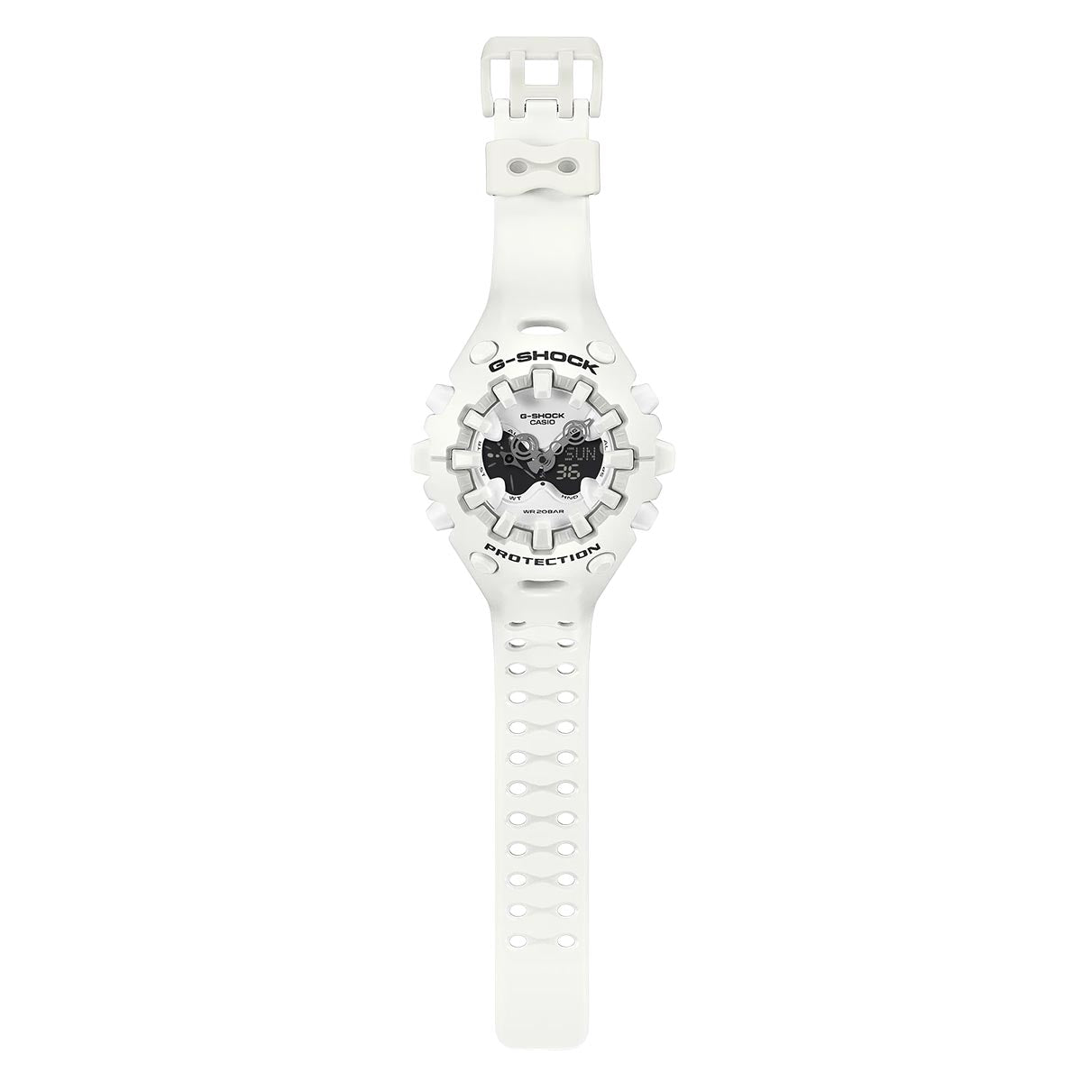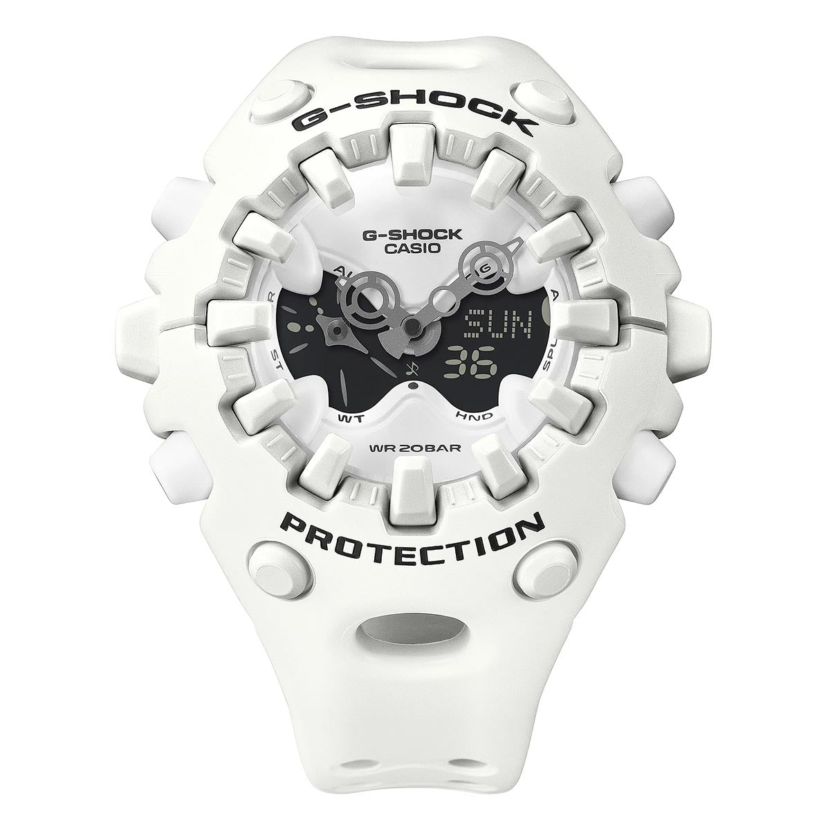 Experience the next evolution of toughness with the G-SHOCK GA-V01 — a bold reinterpretation of G-SHOCK’s signature design and engineering. Its sculpted, organic case with sharp edges, full-screen LCD, and metallic open-work dial deliver a striking fusion of strength and innovation. The standout Shock Release Hand uses a magnetic attachment to absorb impact, allowing for larger, more expressive hand designs. After a strong shock, the minute hand may momentarily shift but automatically realigns within minutes — a testament to G-SHOCK’s uncompromising durability. Finished in a pop-inspired white with an impressive matte finish, the GA-V01 is toughness reimagined.