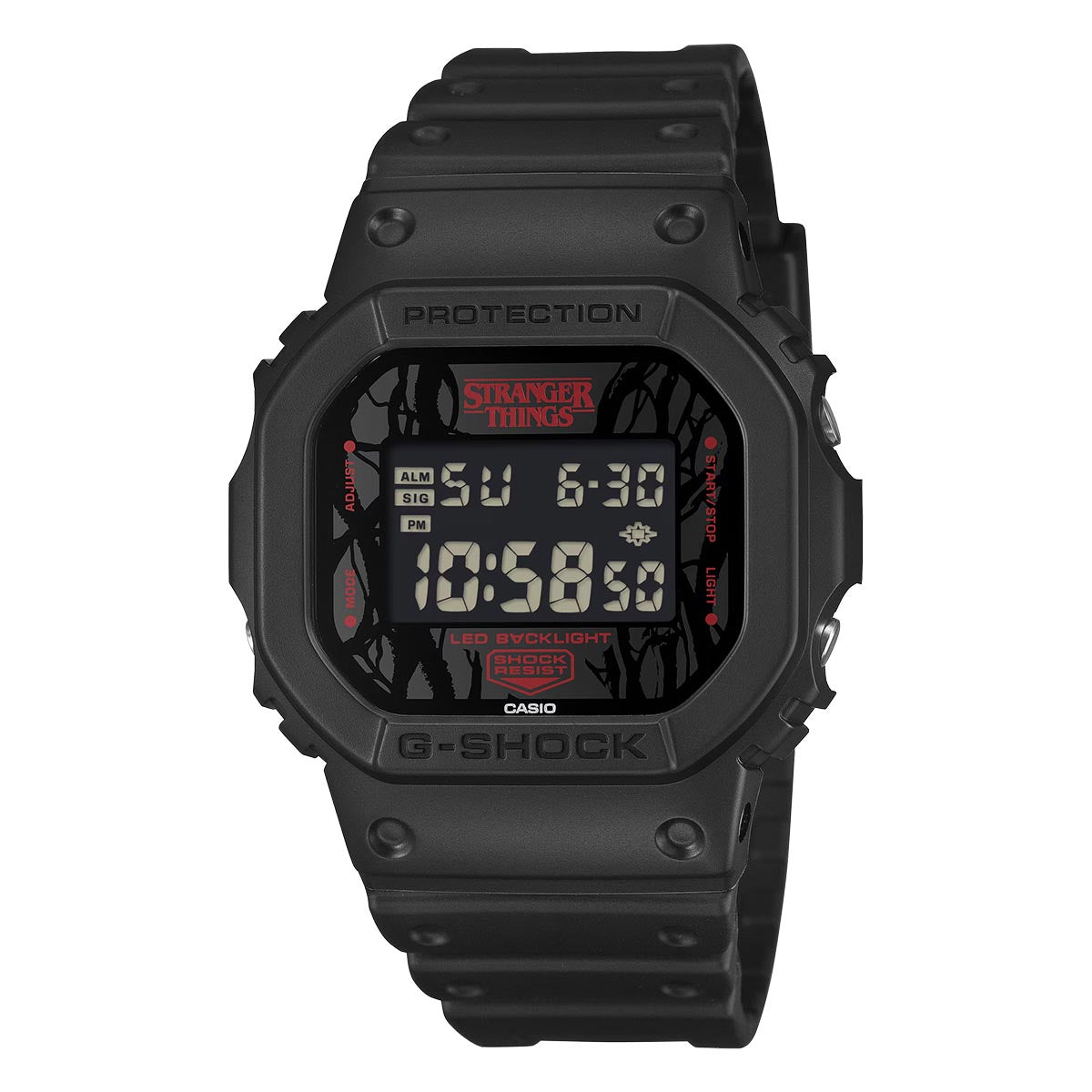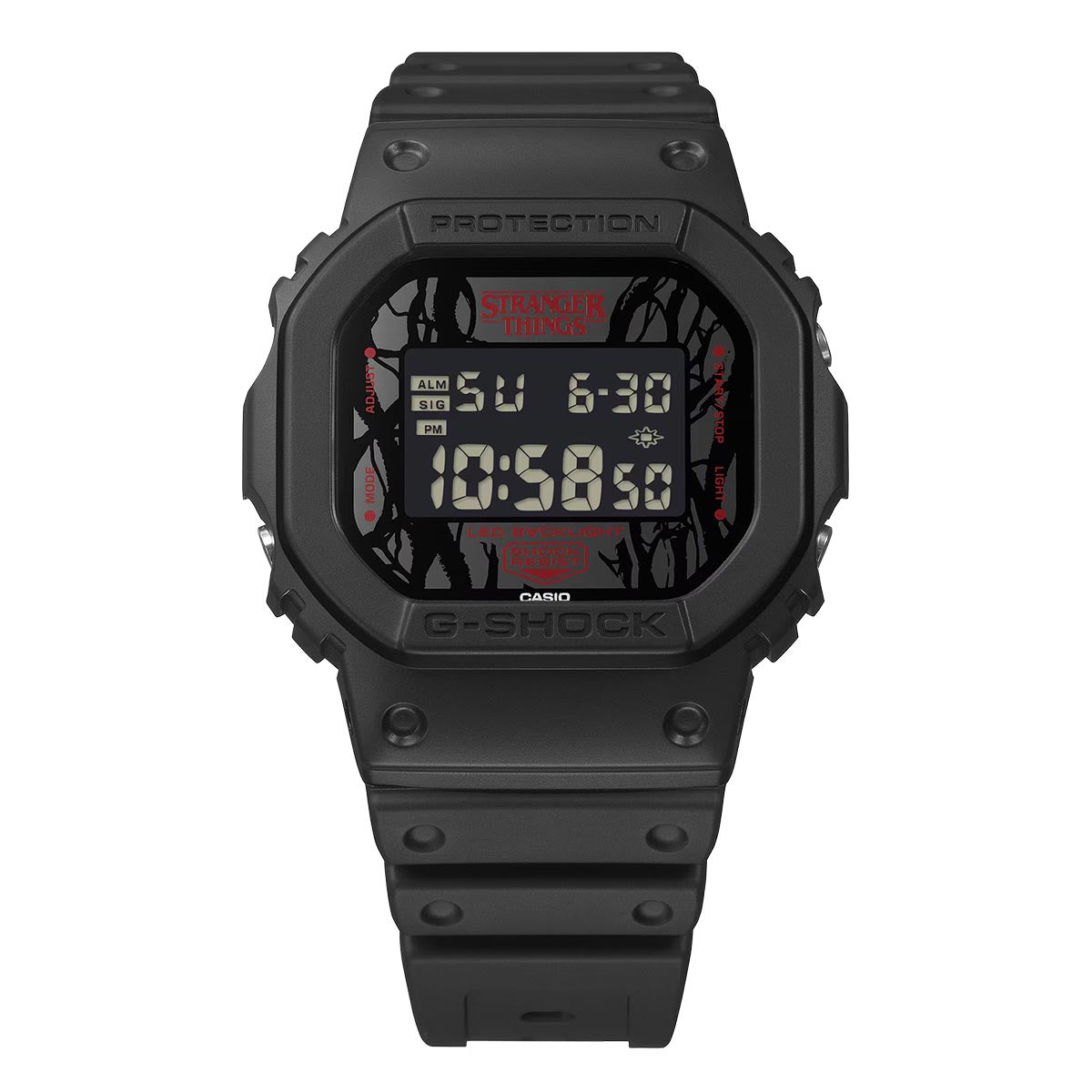 A special collaboration model with the Netflix series "Stranger Things," which will reach its final chapter with Season 5 in November. This timepiece is based on the G-SHOCK DW-5600. Drawing from the dual worlds of the story — the familiar reality and the eerie “Upside Down” — the design weaves key elements of the series into every detail. The dial features a pattern of twisting vines, evoking the creeping influence of Vecna. In a clever touch, the letter “A” in “LED BACK LIGHT” appears upside down, hinting at the connection between dimensions. The red backlight mirrors the show’s signature color palette, casting an atmospheric glow reminiscent of its most intense moments. On the band loop, “011” is printed — a tribute to Eleven, one of the show’s most powerful and beloved characters. The watch comes in special packaging that highlights both the Demogorgon and the signature vines, capturing the threatening forces the characters face throughout the series. This special collaboration celebrates the arrival of Season 5, the final chapter in the Stranger Things saga.