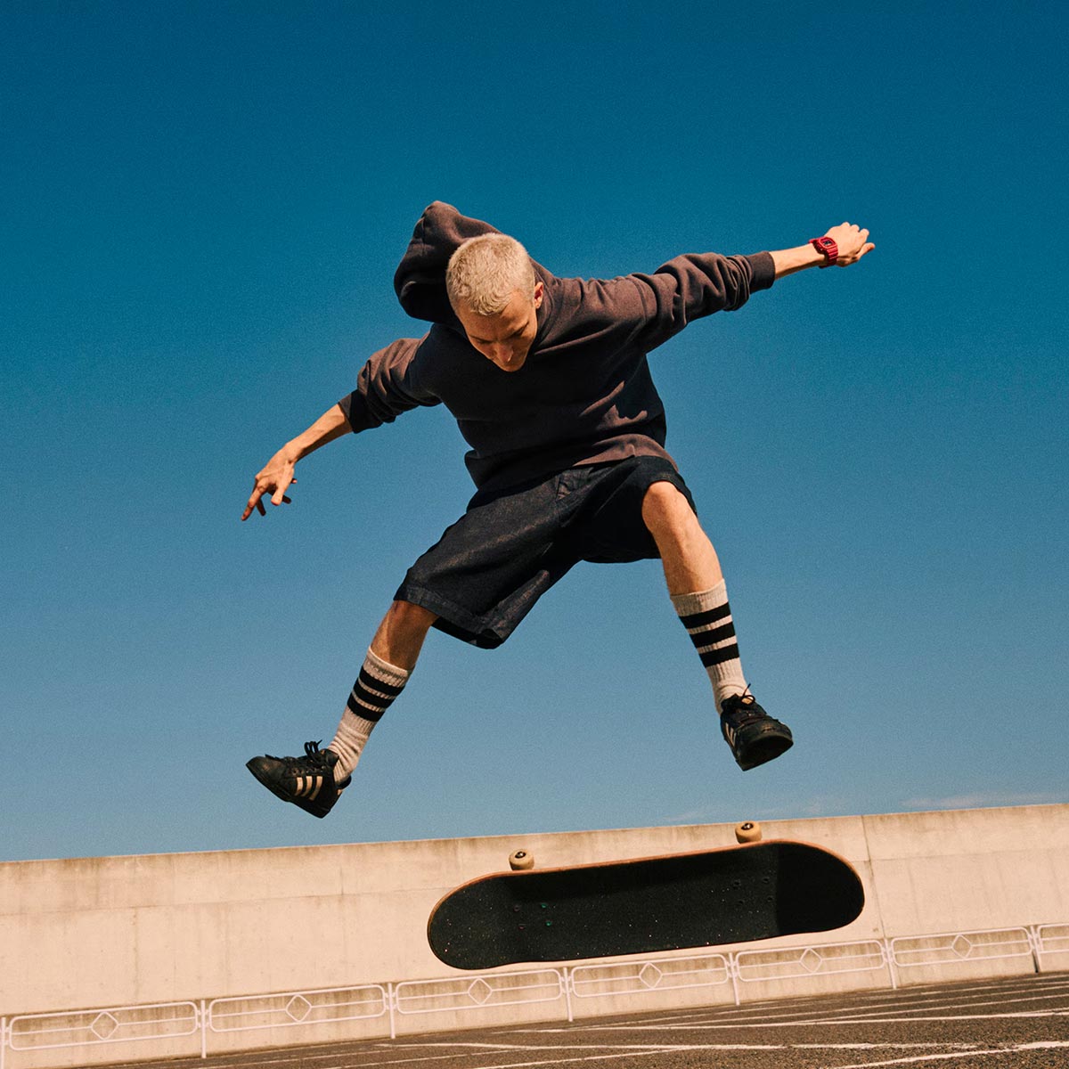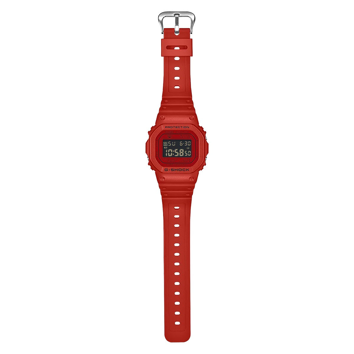 Indulge your passion for bold, bright toughness with an iconic G-SHOCK style in the vivid red loved by trendsetters and athletes the world over. Introducing iconic styles in G-SHOCK brand red: the ever-popular 5600, a direct legacy of the first-ever G-SHOCK. Treated to a vapor deposition finish in red, the watch face blends seamlessly with the red band and bezel, while the dramatic textural contrast exudes strength and intensity. The inverted LCD and touches of black incorporated throughout the design pop against the vibrant red color scheme, the black accents enhancing the impact of the overall design to convey the uniquely tough G-SHOCK identity. Key resin components for the bezel and band are made with bio-based resin, a material expected to help reduce environmental impact. These vibrant watches make a great accessory for your street-savviest fashions and your most casual styles.