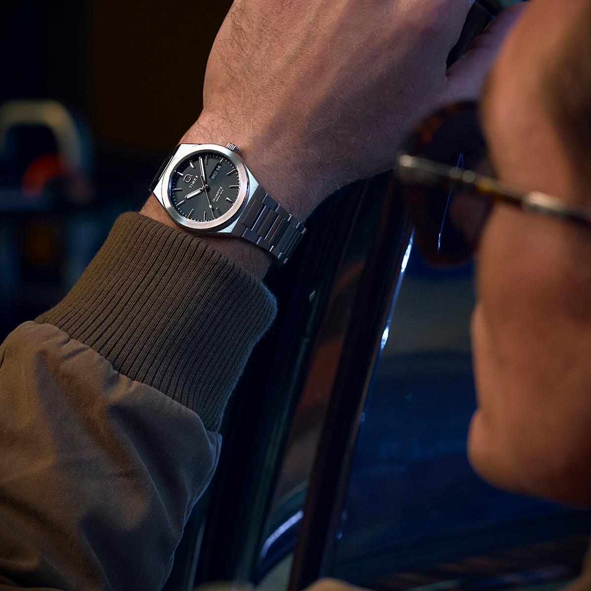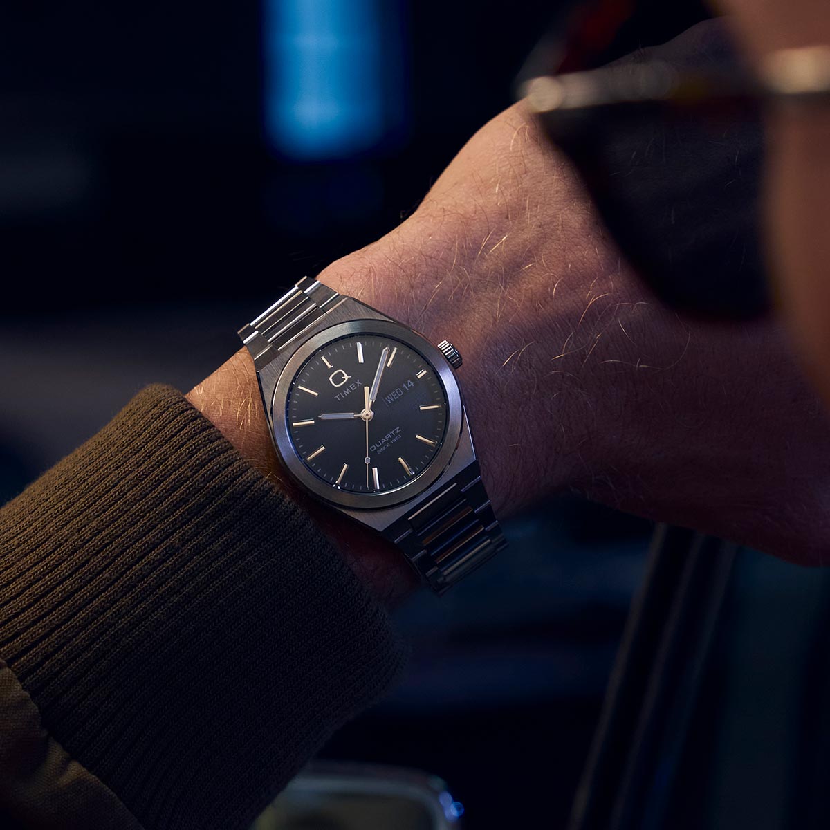 Channelling the bold designs that filled the scene in ‘70s West Hollywood, the Q Timex® Continental brings refinement to our beloved Q Timex collection with a new streamlined 39mm brushed silver tone stainless-steel case with polished edges and a day and date window at 3 o’clock. The simple black dial features a radial texture and a clean presentation that’s effortlessly cool, protected by a flat mineral glass crystal and highlighted by faceted metallic hour markers and luminant hands for enhanced visibility in the dark. Completing the look is a tapered and integrated brushed stainless-steel bracelet that offers a truly ‘70s style as you let the hours slip away.