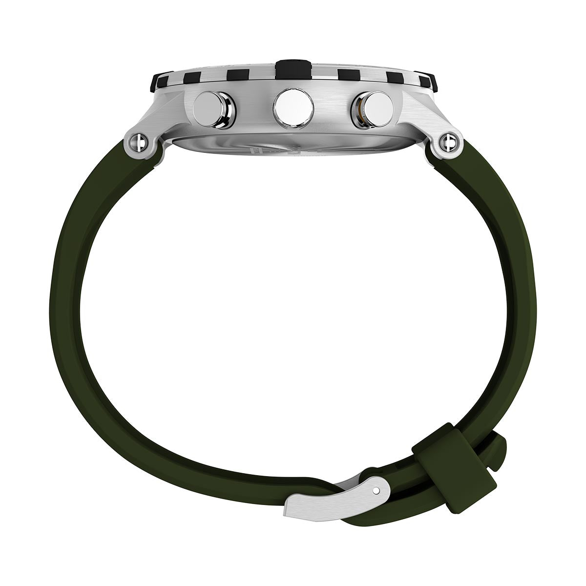 Know the Tides. Track the Temp. Find Your Way. With multiple functions including a tide tracker, temperature sensor that can read the air or water temperature, and analog compass display all driven by a dedicated fourth hand, Timex Tide-Temp-Compass is the ultimate accessory for the tech-savvy professional with a love for adventure. We've updated it with a 45mm brushed recycled 316L stainless-steel case that’s resistant to rust and corrosion, an incredibly durable yet soft silicone strap, and an earthy green dial housed under a mineral glass crystal. Other details include luminescent hands and hour markers for enhanced visibility in low-light conditions, a convenient date window at the 6 o’clock mark, polished pushers, vibrant yellow detailing, and 100m of water resistance.