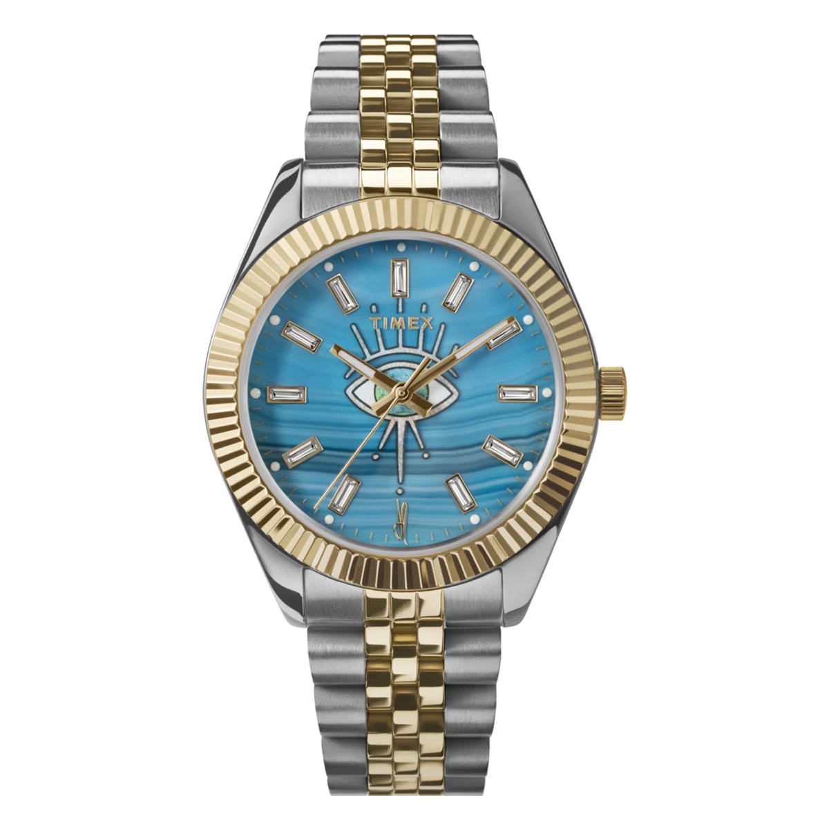 The Timex x Jacquie Aiche Eclipse collection is a reminder that even in moments of stillness and shadow, your light is always present. Designed in collaboration with ethereal jewelry designer Jacquie Aiche, this update to our Timex Legacy features a natural blue agate dial—a soothing stone that’s long been thought to promote spiritual growth. Faceted Austrian crystals mark each hour and glimmer with your every movement, while Jacquie’s signature Tribe Eye motif appears as a symbol of intuition, protection, and inner knowing. A 36mm polished stainless-steel case pairs with an elegantly fluted bezel and a matching brushed and polished bracelet to keep you shining all day long. Add it to your wrist stack as a reminder to trust that every phase of your journey is destined to bring you closer to yourself.