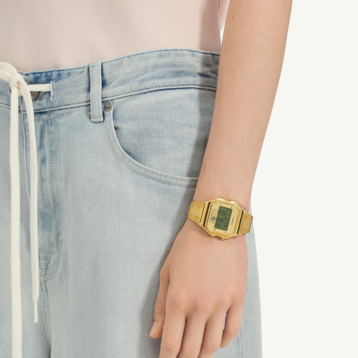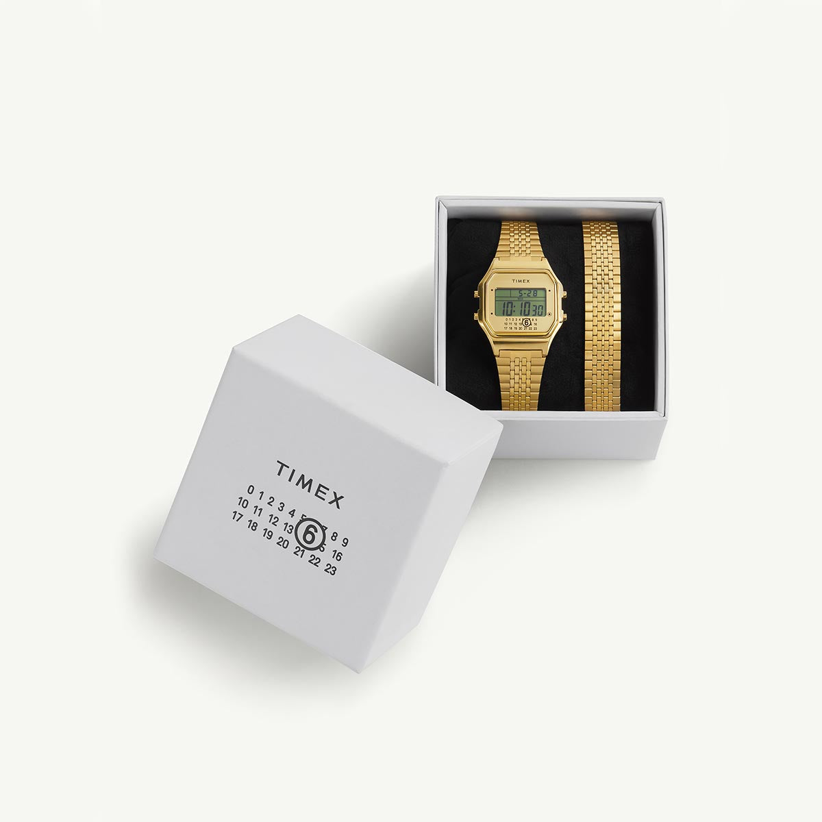 A bold continuation of the MM6 Maison Margiela x Timex collaboration, the T80 Gift Set translates the collection’s concept of expressive utility in a classic gold-tone iteration. Merging Timex’s heritage of precision and craftsmanship with MM6’s avant-garde approach, the watch embodies a sleek, contemporary minimalism that adapts effortlessly to any style. It features a 34mm polished stainlesssteel case with a brushed and polished bracelet in gold tone, complemented by a mineral lens that reveals a mirrored mask displaying a sequence of digits from 0 to 23, with ‘6’ encircled as a subtle homage to MM6’s numerical signature. Retaining the T80’s hallmark functionalities—chronograph, daily alarm, timer, month and date display, and the signature INDIGLO® backlight for night visibility—the piece reimagines a Timex classic through MM6’s distinctive viewpoint.