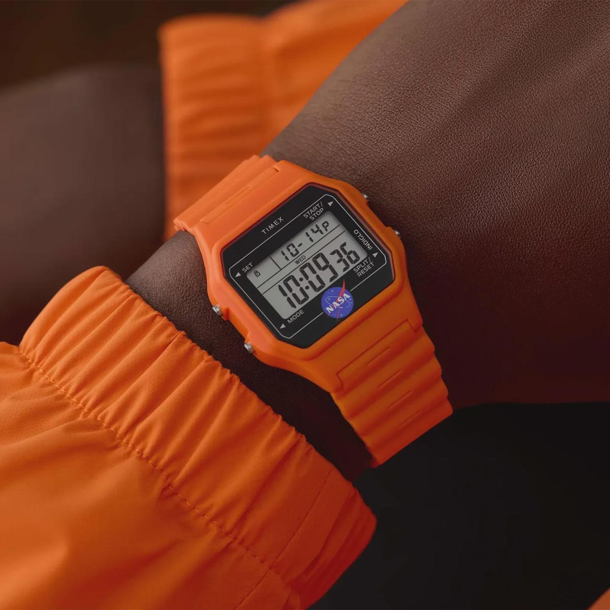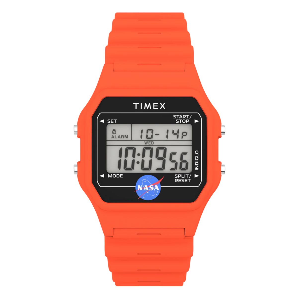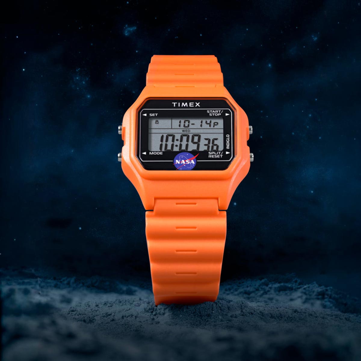 This Timex watch celebrates humanity's journey to the farthest reaches of space. Built with a lightweight resin case and bracelet in space-suit orange, it channels both utility and uplift. Other details include our INDIGLO® backlight for nighttime visibility, a day and date function, alarm, timer, and the iconic NASA insignia on the black lens.