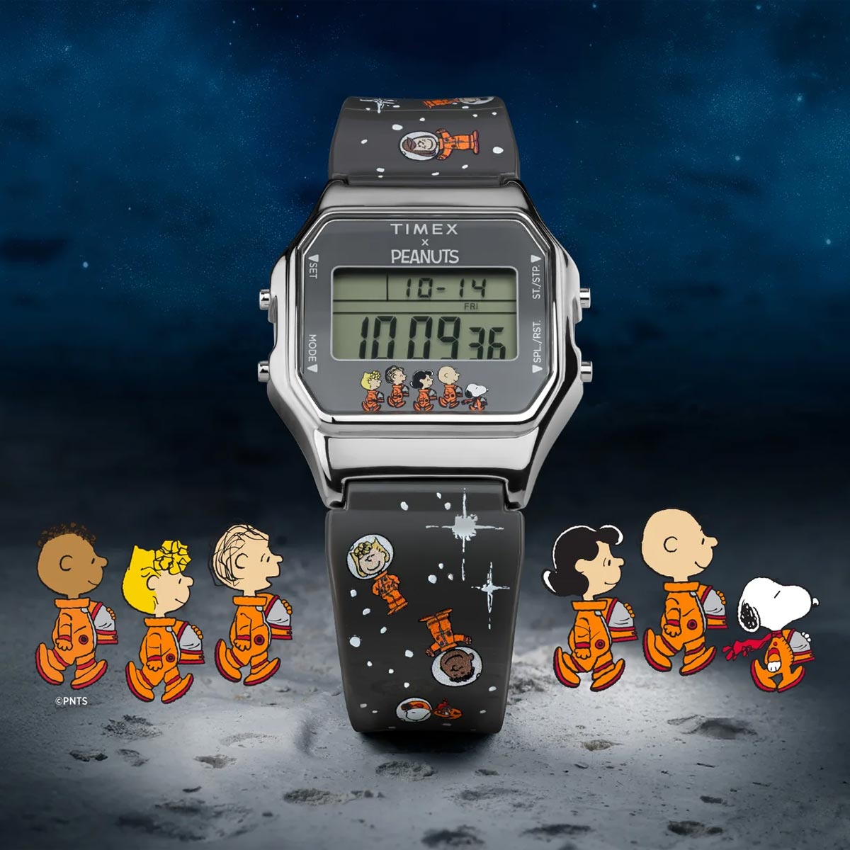 Ready for Lift-off! - Inspired by mankind’s leap into the cosmos, the Timex x Peanuts Space Collection brings Snoopy and the gang to a whole new frontier. On this adorable update to our retro-style T80, the Peanuts gang suits up for space travel on the dark grey lens and floats against a cosmic backdrop on the flexible dark grey resin strap. Fun and functional, it features a 34mm polished silver-tone case and includes all the features you’d expect from our beloved T80: chronograph, daily alarm, and timer. Perfect for adding a bit of nostalgia and wonder to your everyday style, this watch is a celebration of adventure, imagination, and the joy of dreaming big.